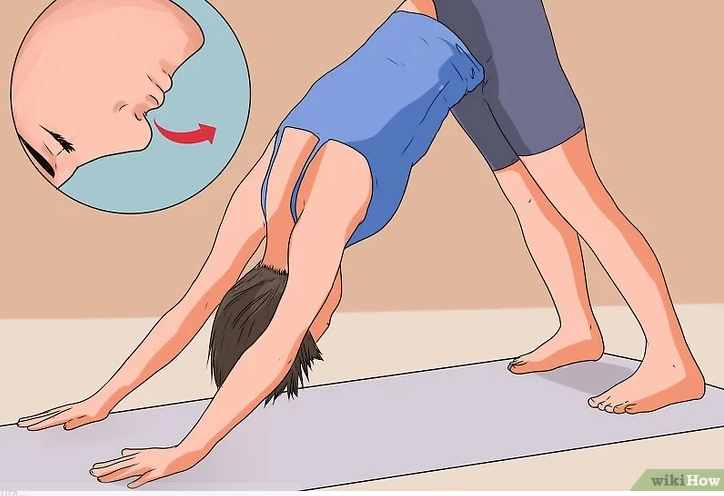 Exhala, separa las rodillas ampliamente, junta los pies, estira los brazos hacia el frente con el vientre entre tus piernas y empuja hacia atrás y hacia arriba para entrar en la postura del perro mirando hacia abajo. Partiendo desde la balasana, o la postura del niño, exhala y empuja los isquiones hacia el techo. Debes terminar en posición de «V» invertida, es decir, en la postura del perro mirando hacia abajo o adho mukha svanasana en la lengua sánscrita.[16] Esta posición debe sentirse tranquilizante y permitirte descansar a medida que profundizas en la asana o postura.